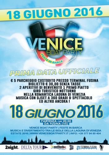 Per l'Estate 2016, da Giugno ad Settembre, Venice Boat Party©, presenta degli eventi a tema supportati da Musica con Dj a rotazione, Drinks & Food con servizio catering, Animazione, Videoriprese, Foto...e tutto quello che puó servire per dare la giusta atmosfera ad un evento speciale. Venice Boat Party© collabora con le migliori aziende di navigazione per garantire ai nostri ospiti la massima sicurezza.Sono incluse inoltre, collaborazioni con i migliori locali del Veneto, alcune riviste dedicate allo spettacolo e partners promozionali.