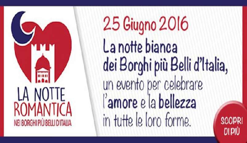 Appuntamento a Vallo di Nera sabato 25 giugno per la Notte Romantica dei Borghi più Belli d'Italia. La cittadina della Valnerina ha aderito all'iniziativa nazionale che festeggerà gli innamorati nelle notti del solstizio d'estate. Un appuntamento da non mancare, dedicato all'amore e alla bellezza in tutte le sue forme, che si svolgerà nelle piazze, nei vicoli, negli angoli più suggestivi del villaggio medievale. In programma cene a lume di candela servite nei ristoranti locali, dove tra una ghiottoneria e l'altra sarà possibile gustare il dolce della passione 'Pensiero d'amore', (la ricetta creata per l'occasione verrà servita in tutta Italia), concerti, passeggiate, letture d'amore nella Casa dei Racconti e il bacio mozzafiato di mezzanotte con lancio di palloncini a forma di cuore.
