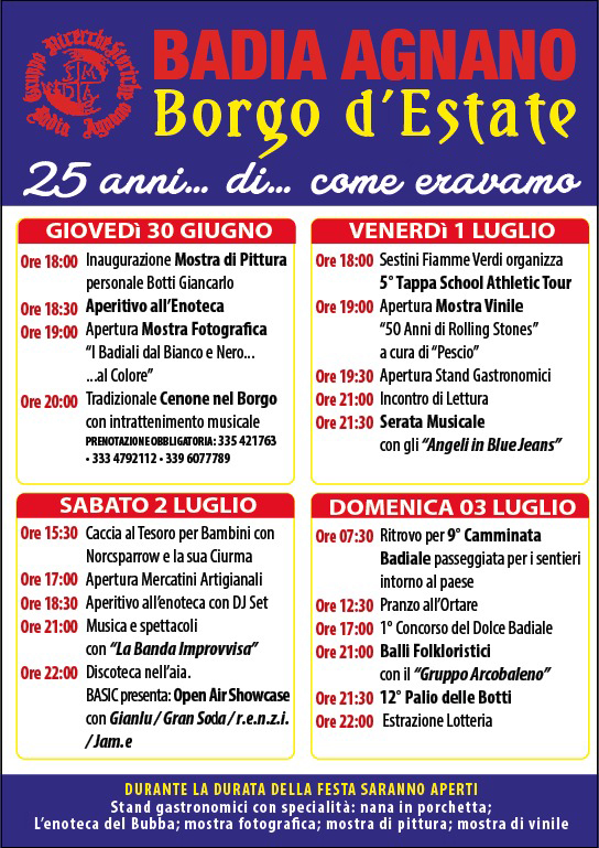 Dal 30 Giugno al 03 Luglio 2016 - Festa a Badia Agnano - Bucine - Arezzo