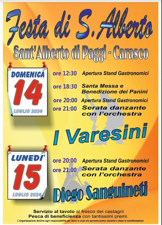 A Sant'Alberto di Paggi, frazione del Comune di Carasco in provincia di Genova si svolge nei giorni 14 e 15 Luglio 2024 la Festa Patronale di Sant'Alberto.