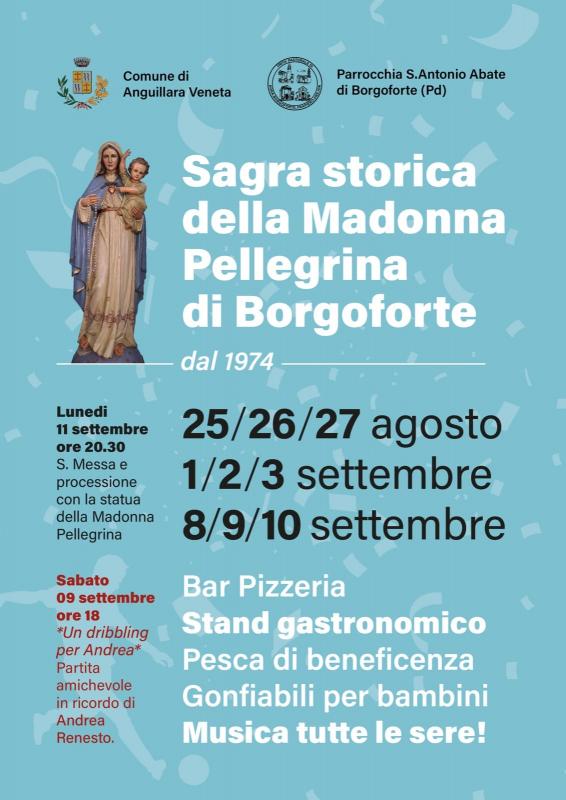 Dal 25 al 27 Agosto 1-2-3 e 8-9-10 Settembre 2023 , tutti i venerdì, sabato, domenica, si terrà a Borgoforte la Sagra della Madonna Pellegrina con un ricco stand gastronomico, Intrattenimento musuicale dal vivo, e i sabati e le domeniche sono previste le aree per bambini.
