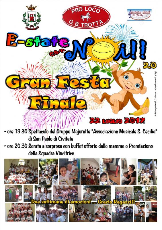 La Pro-Loco di Castelnuovo della Daunia con il Patrocinio dell'Amministrazione Comunale, organizza la Gran Festa Finale del Primo Evento dell'Estate svoltosi dal 10 al 21 luglio 2017, per tutti i bambini dai 3 anni in su ... 20 animatori per più di 80 tra bambini e ragazzi hanno animato le strade del paese con canti, urla e giochi...