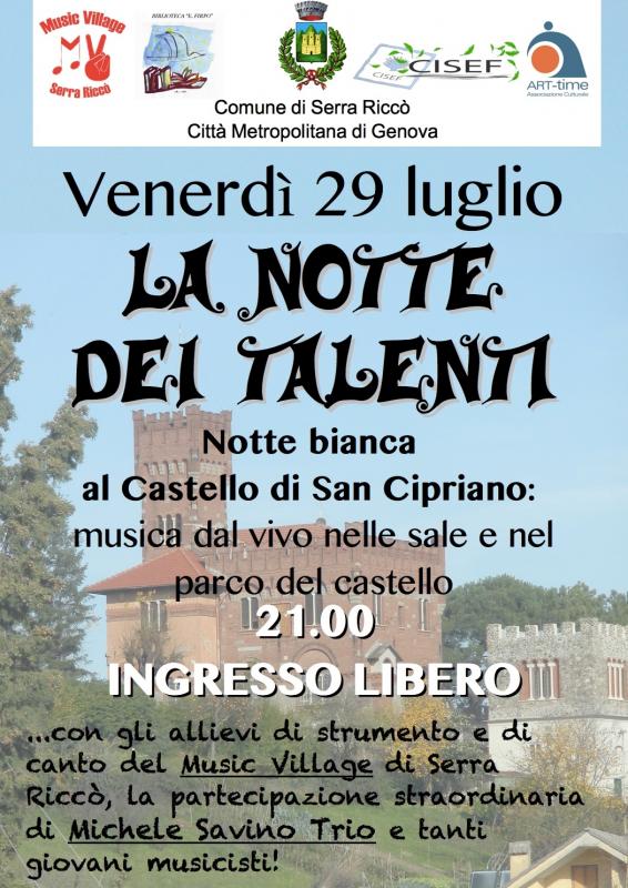 Il Comune di Serra Riccò in collaborazione con Music Village, Art Time, Sacrabandu asd, le scuole di musica del territorio e la banda musicale N.S. della Guardia di Genova Pontedecimo organizzano “La notte dei Talenti”, la notte bianca, venerdì 29 luglio a partire dalle ore 21.00 presso il Castello di San Cipriano.