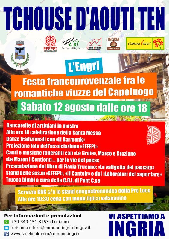 "Cose di altri tempi" vi aspetta anche quest'anno a Ingria con padiglione gastronomico a base di menù tipico di montagna, musiche e balli francoprovenzali, oltre a più di 40 espositori di artigianato locale! Le novità di quest'anno saranno la presentazione del libro di Flava Trucano "La Valigetta del passato" e la partecipazione straordinaria del gruppo Folk "Li Barmenk" che animeranno fino a tarda notte l'ormai imperdibile evento dell'estate ingriese, che ogni anno attira centinaia di appassionati della montagna e della cultura Francoprovenzale, per un appuntamento che è ormai diventato nel tempo la festa dell'orgoglio di essere Valsoanini!
