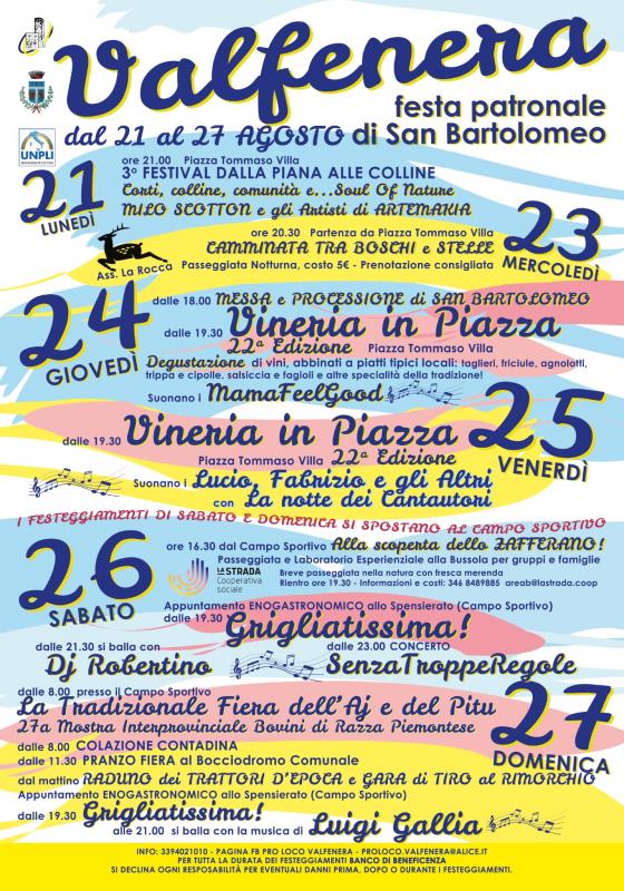 27° Mostra Interprovinciale di bovini di razza piemontese, accanto alla Fiera dl'aj e del Pitu. Gara di tiro al rimorchio. Raduno di trattori d'epoca. Intrattenimento per bambini. Associazioni di Valfenera attive ad intrattenere grandi e piccini. Musica. Colazione contadina allo stand proloco. Presso il bocciodromo Pranzo della Fiera, per ricaricare le batterie per proseguire...