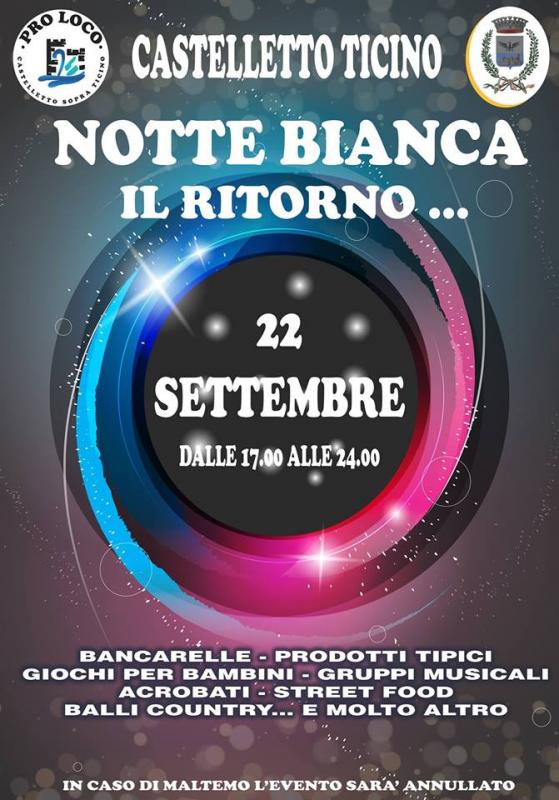 A Castelletto Sopra Ticino in provincia di Novara si svolge nella giornata di Sabato 22 Settembre 2018 la Notte Bianca...il Ritorno.