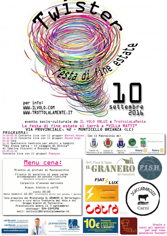 sono lieta di invitarvi all’evento “Twister- festa di fine estate” che si svolgerà Sabato 10 settembre a partire dalle ore 19.00 presso la Comunità Terapeutico Riabilitativa “Villa Ratti”a Monticello Brianza organizzata dalla Cooperativa Sociale “Il Volo – ONLUS” e da TrottolaLaMente di Merate, associazione di promozione sociale, con un concerto di gruppi musicali a suon di Blues e Rock & Roll. Ci sarà anche uno spettacolo per bambini e famiglie: “Chi trova cerca – il viaggio di Olivia” con un Rossana Maggi che disegnerà dal vivo durante lo spettacolo.