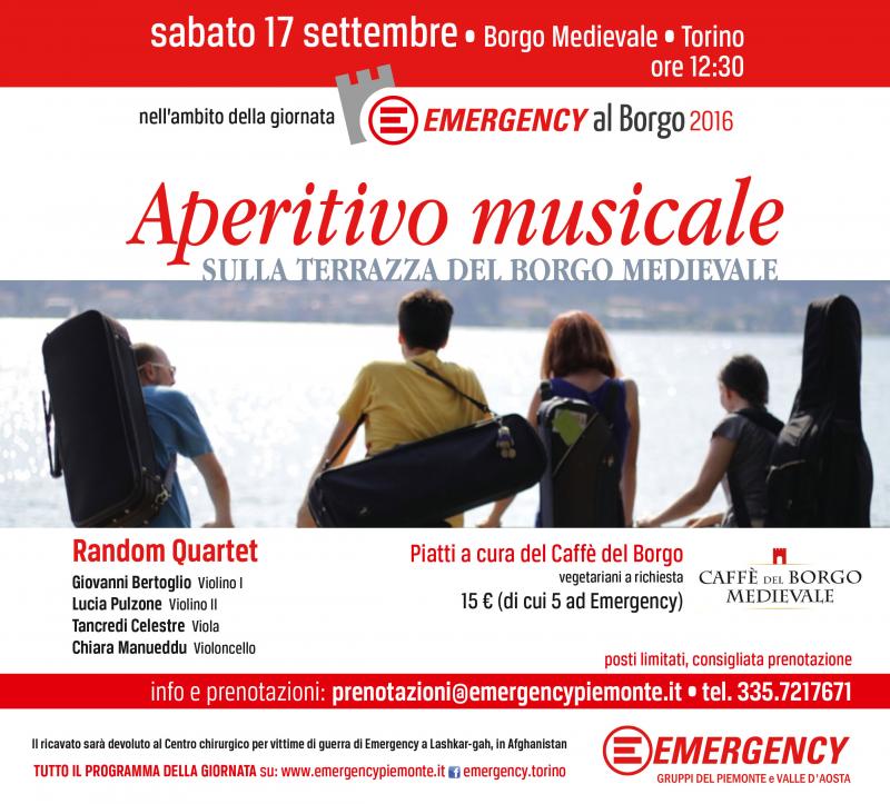 - 12.30 Terrazza Caffè del Borgo: Aperitivo Musicale con il Random Quartet. Piatti a cura del Caffè del Borgo: 15 € (di cui 5 a Emergency) (consigliata prenotazione)