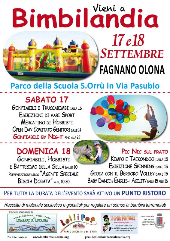 Buona cucina, gonfiabili, pony, truccabimbi, giochi, associazioni, bancarelle, cultura, divertimento, simpatia e solidarietà con raccolta giocattoli e materiale didattico per i bambini vittime del terremoto ... e tante altre sorprese vi aspettano volentieri nell'area verde delle scuole Orrù in via Pasubio a Fagnano Olona per trascorrere insieme dei momenti in buona compagnia.