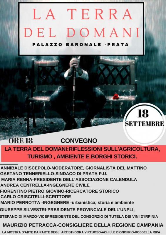 Durante i due giorni dell'evento sarà possibile visitare i beni storici di parte dalle ore 16-19.il fulco dell'evento culturale si terrà il 18 Settembre (domenica), alle 10.30 circa, prenderà avvio la giornata ecologica nel borgo storico di Prata a cura dell'associazione calendula e dei volontari locali, mentre presso il Palazzo Baronale, si sensibilizzera', attraverso riflessioni e testimonianze, con l'Associazione no profit "No vuol dire No" contro la violenza sulle donne e sui minori. Nel pomeriggio, alle 18 circa nel Palazzo Baronale, il convegno LA TERRA DEL DOMANI:RIFLESSIONI SU AGRICOLTURA- TURISMO- AMBIENTE e Borghi storici, dove saranno presenti Maria Renna (Calendula), Fiorentino Giovino (ricercatore storico), l ING. Andrea Centrella (recupero storico e innovazione), l ING. Mario.Perrotta (urbanistica, storia e ambiente), Stefano di Marzo vicepresidente del consorzio tutela vini d'irpinia, Giuseppe Silvestri presidente dell UNPLI, il consigliere regionale l arch Maurizio Petracca.