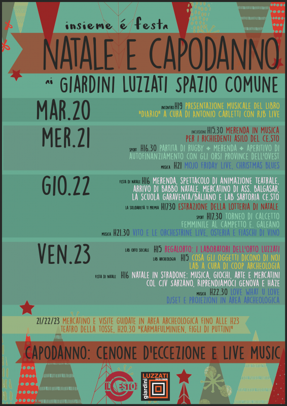 Si apre martedì 20 dicembre, con la presentazione in musica del libro “Diario” dell’attore-autore genovese Antonio Carletti, una serata magica tra narrazione di alcuni racconti tratti dal libro e non e interventi musicali, la quattro giorni di festeggiamenti natalizi dei Giardini Luzzati - Spazio Comune, il nuovo progetto - selezionato dal Comune di Genova - del Ce.Sto con Cooperativa Archeologia e Fondazione Luzzati - Teatro della Tosse. E’ il primo Natale di questo progetto che mira a fare da connettore, sociale e culturale, fra il quartiere, la città e gli stranieri – turisti e immigrati – che si trovano a Genova, in questo momento.