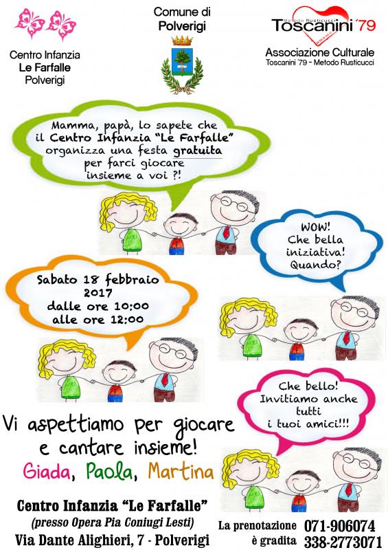 Il Centro Infanzia Le Farfalle, in collaborazione con il Prof. Fulvio Rusticucci, ha deciso di organizzare una festa per far giocare insieme bambini e genitori. Il Centro situato a Polverigi in Via Dante Alighieri 7 presso l’Opera Pia Coniugi Lesti, struttura che si occupa di educazione da oltre 150 anni, accoglie bambini dai 6 ai 36 mesi, ma per l’occasione ha deciso di ospitare bimbi di qualsiasi età.