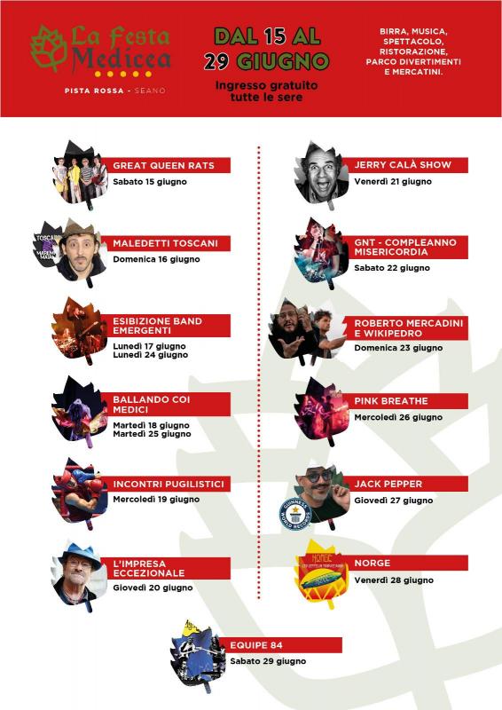 Dopo il grande successo della prima edizione, torna la Festa Medicea di Seano, alla Pista Rossa. Quindici giorni di eventi, incontri e concerti a ingresso gratuito.