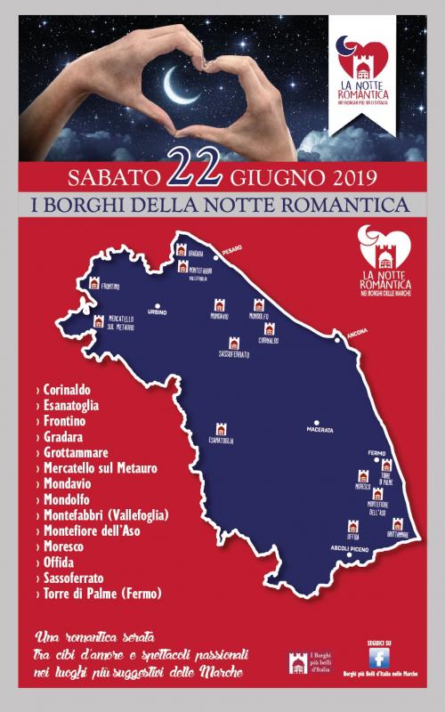 Nelle marche sono 14 i borghi che aderiscono alla notte romantica e sono Corinaldo (AN) Esanatoglia (MC) Frontino (PU) Gradara (PU) Grottammare (AP) Mercatello sul Metauro (PU) Mondavio (PU) Mondolfo (PU) Montefabbi di Vallefoglia (PU) Montefiore dell'Aso (AP) Moresco (FM) Offida (AP) Sassoferrato (AN) e Torre di Palme (Fermo) seguite i programmi sulle pagine dei comuni o sulla pagina facebook dell'associaizone regionale de I Borghi più belli d'Italia nelle Marche @borghimarche!
