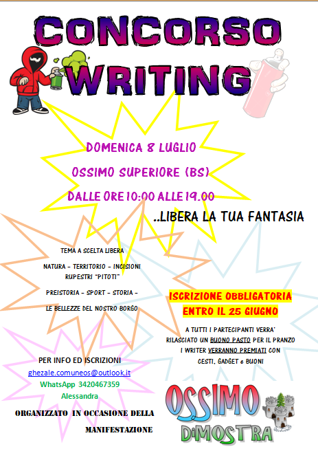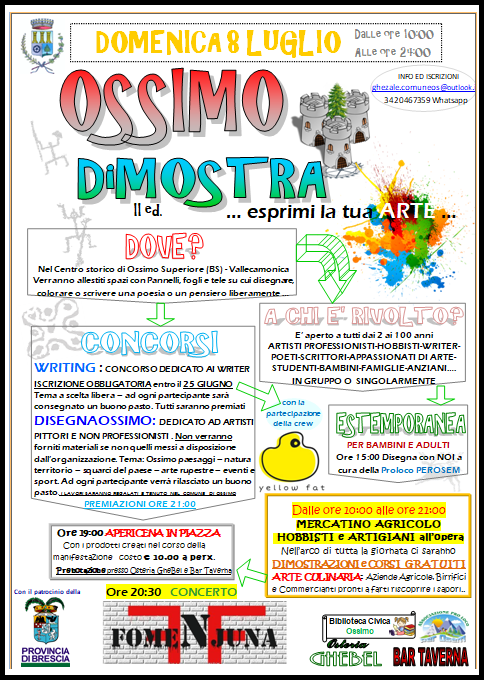 Il comune e le associazioni, metteranno a disposizione fogli, pennelli, tempere e tutto il materiale, gratuitamente, così che l'ospite potrà esprimersi attraverso disegni frasi poesie ritratti e dipinti. Sono indetti due concorsi WRITING dedicato ai writer, con la partecipazione della crew yellow fat- e il concorso DISEGNA OSSIMO dedicato ad artisti professionisti e non.