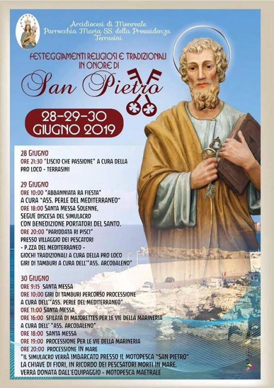 Anche quest’anno, a Terrasini si tengono nei giorni 28, 29, 30 giugno 2019 i tradizionali festeggiamenti in onore di San Pietro, Santo protettore dei pescatori e dell’abbondanza del pescato.