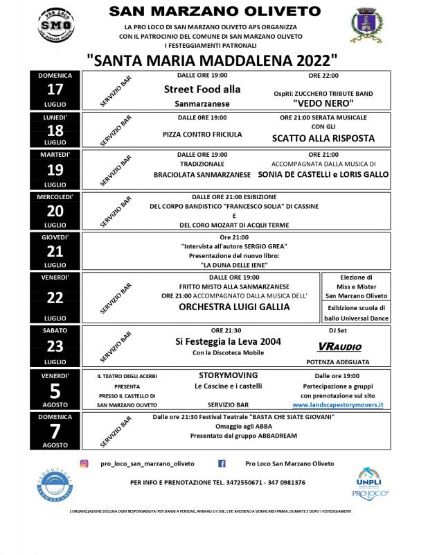 L'associazione turistica Pro Loco di San Marzano Oliveto con il patrocinio del comune di San Marzano Oliveto organizzano i festeggiamenti patronali SANTA MARIA MADDALENA 2022