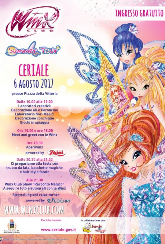 L'appuntamento per tutti i fan domenica 6 Agosto proprio a Ceriale, dove Piazza della Vittoria è pronta a trasformarsi in un Winx Village a misura di fata.Il magico programma prevede giochi, laboratori creativi e tante attività “fatate”, speciali incontri con le Winx e una festa sotto le stelle.
