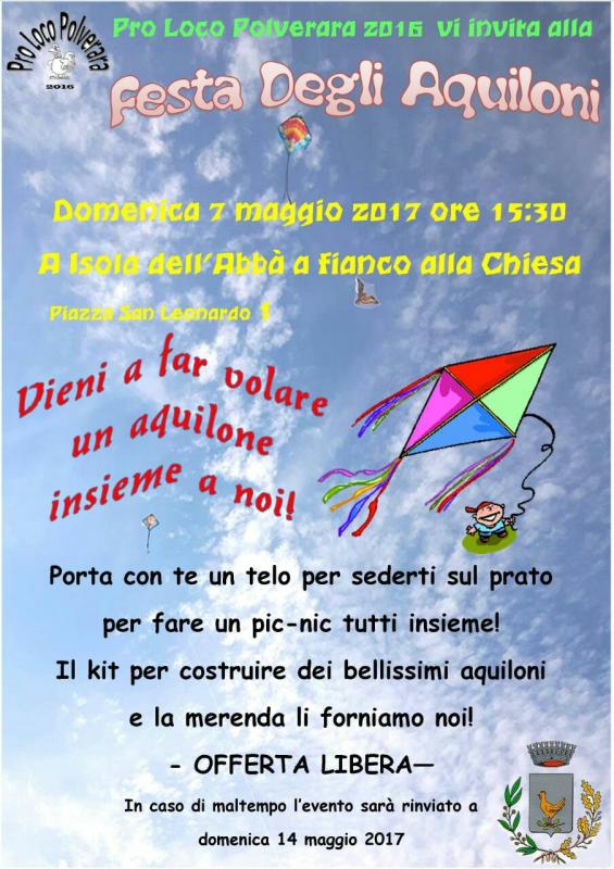 Domenica 14 maggio 2017 si svolge la Festa degli Aquiloni a Polverara, precedentemente programmata per domenica 7 maggio e rimandata a causa del maltempo.