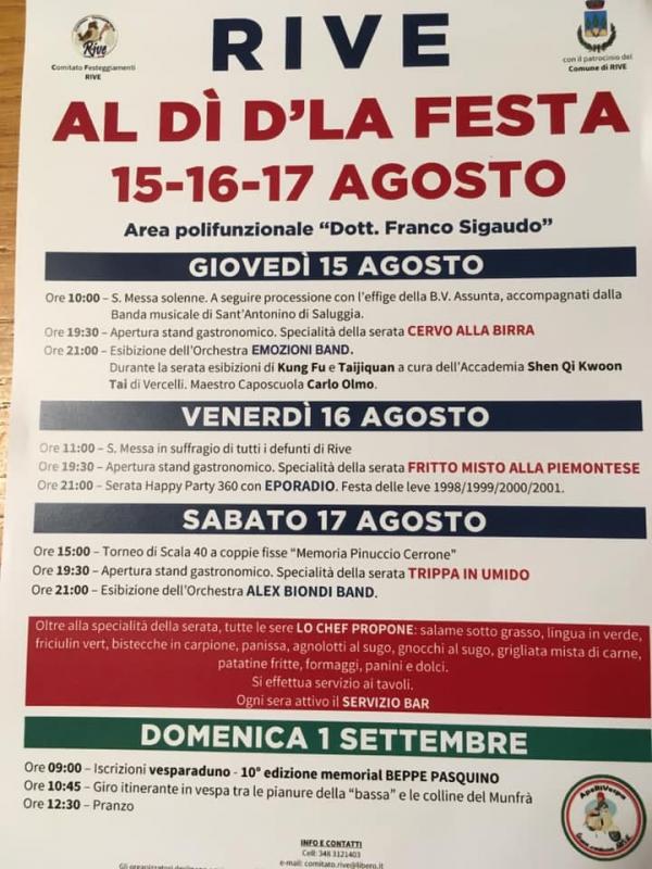 Dal 15 al 17 agosto 2019 a Rive si svolge Al dì d'la Festa, la tradizionale festa patronale di Rive.
