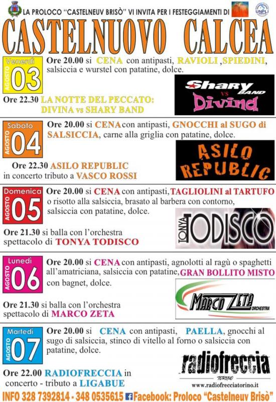 La proloco "Castelneuv Brisò" di Castelnuovo Calcea è lieta di invitarvi ai festeggiamenti patronali che si terranno da giovedì 3 agosto a martedì 7 agosto 2018 nella splendida location del castello.