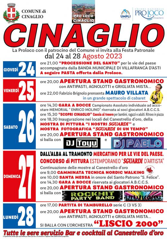 Dal 24 al 28 agosto 2023 si svolge la tradizionale Festa Patronale a Cinaglio.
