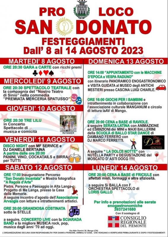 Iniziano martedì 8 agosto con la gara a carte i tradizionali festeggiamenti estivi a San Donato di Mango; mercoledì 9 agosto va invece in scena, alle ore 20.30, la compagnia Il Nostro Teatro di Sinio con la commedia “Premiata Merceria Spatusso”. Giovedì 10 agosto alla stessa ora il concerto-spettacolo dei Tre Lilu “Mutandem”, mentre venerdì 11 a partire dalle ore 20 “Disco Night” con MF Service e Daniele Bertaina, con panini, vino cocktail e birra per tutti.