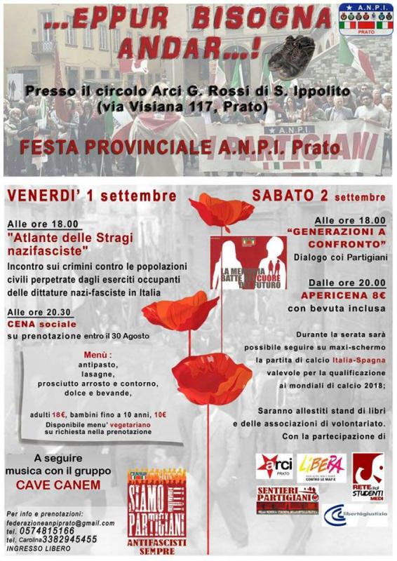 Ad aprire la rassegna, alle 18.00 di venerdì 1 settembre, l'incontro sull'Atlante delle stragi nazifasciste, realizzato da ANPI insieme all'INSMLI, per denunciare i crimini di eserciti e milizie occupanti contro la popolazione civile, e particolarmente interessante rispetto anche ai tentativi di revisionismo e alle derive neofasciste emerse di recente. A seguire, venerdì sera cena partigiana con soci e simpatizzanti dell'A.N.P.I.– richiesta la prenotazione – e infine musica con il gruppo 'Cave Canem'.