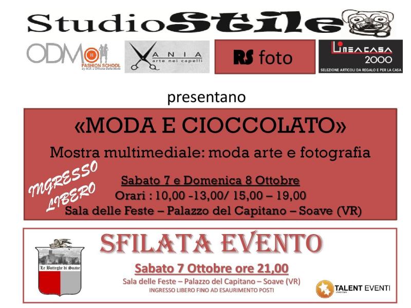 In concomitanza della manifestazione ‘’Cioccolato in festa”, sabato 7 e domenica 8 Ottobre 2017 si terrà l’evento “Moda & Cioccolato”, presso la Sala delle Feste del Palazzo del Capitano, in via Camuzzoni 8 a Soave (Vr).
