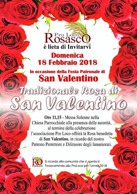 La Pro Loco Rosasco è lieta di invitarvi Domenica 18 Febbraio 2018, in occasione della Festa Patronale di San Valentino alla Tradizionale Rosa di San Valentino.