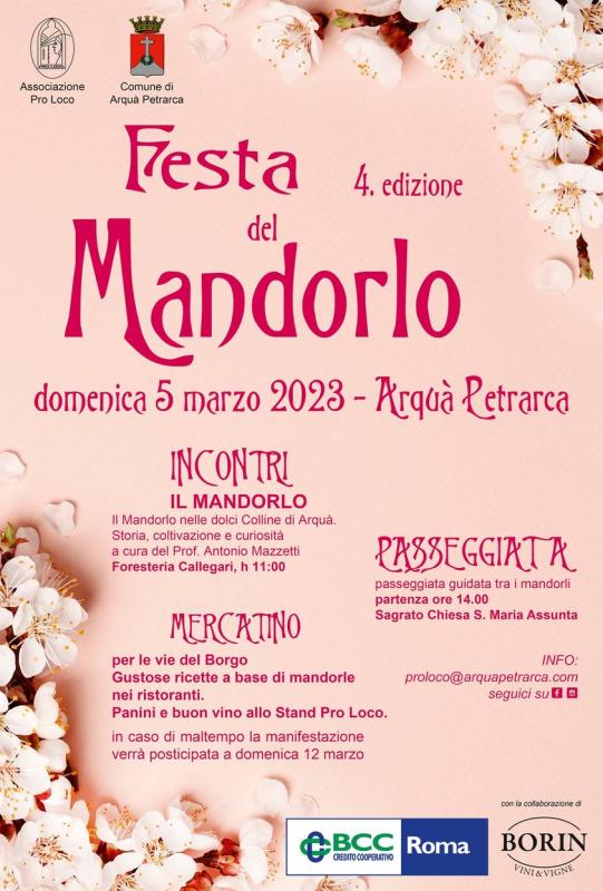 A partire da queste riflessioni Fabio Gemo, presidente e fondatore della Confraternita dea Brìtoea ha pensato di poter organizzare la Festa del Mandorlo. Una festa con lo scopo di valorizzare questo frutto e di stimolare i produttori locali a considerare il suo potenziale straordinario in ambito enogastronomico e della cosmesi.Ma anche un’occasione per essere presenti ad Arquà Petrarca con una festa primaverile che manca in questo territorio se si considera che buona parte delle altre festività si svolgono in autunno.Un primo piccolo passo ma che sta già avendo un interessante successo con la messa a dimora di centinaia di nuove piante.