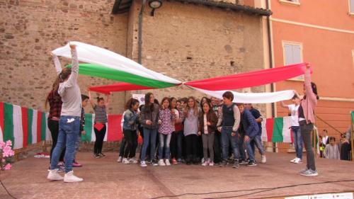 Nella foto: gli alunni e le alunne durante lo spettacolo organizzato per la festa del 25 Aprile dello scorso anno.