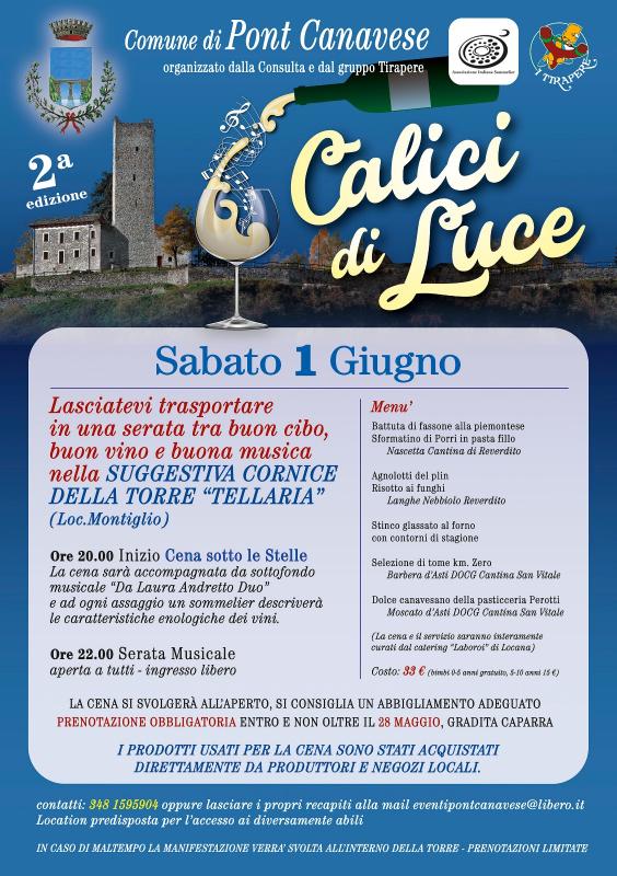 Saranno due giornate ricche di appuntamenti a partire dalla cena di sabato con degustazione di vini canavesani nella suggestiva cornice della Torre Tellaria, una cena raffinata dove ogni portata sarà accompagnata da un calice di vino e dall'esperta spiegazione di un sommelier in una location unica, con vista panoramica sull'intero paese.