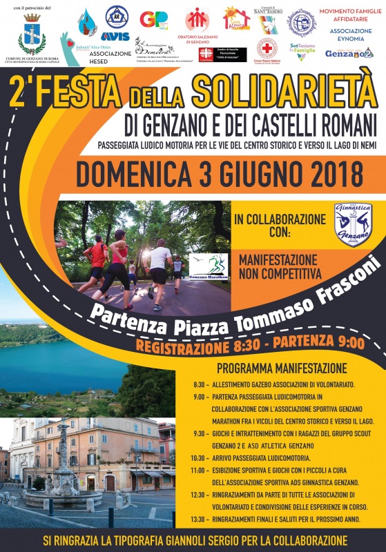 Le associazioni di volontariato dei Castelli Romani in questo modo fanno rete e si riuniscono in un Tavolo di Coordinamento per la Famiglia promosso dall’Oratorio Salesiano di Genzano di Roma insieme all’Ufficio Pastorale Familiare della Diocesi di Albano Laziale. Per comunicarlo a tutta la cittadinanza di Genzano di Roma e degli altri paesi dei Castelli Romani hanno organizzato la “2^ FESTA DELLA SOLIDARIETA’ DI GENZANO E DEI CASTELLI ROMANI” che si terrà con il Patrocinio del Comune di Genzano di Roma domenica 3 giugno 2018 in piazza Tommaso Frasconi a Genzano. Durante la manifestazione ci sarà con partenza da Piazza Frasconi alle ore 9:00 una Passeggiata ludico-motoria in collaborazione con l’Associazioen Genzano Marethon per i vicoli del centro storico e verso il Lago di Nemi. Nella piazza fin dal mattino saranno allestiti i gazebo di Casa Alessia Onlus,Caritas di Genzano di Roma, C.I.C.A.R.(Coordinamento Immigrazione Castelli Romani),Associazione Salesiani Cooperatori centro locale di Genzano di Roma, Movimento Famiglie Affidatarie, Comunità S.Egidiio, Associazione Demetra, Centro Arcipelago, Associazione Indomit’Alice, , Associazione promozione sociale Hesed, Associazione SosteniAMO la famiglia,Croce Rossa Italiana comitato Comuni dell’Appia, Associazione AVIS comune di Genzano di Roma,Associazione culturale Eynomia Happy, Associazione Famiglie di Genzano di Roma, Centro di Aiuto alla Vita “Giovanni Paolo II” Onlus, Gruppo Scout Genzano 2. Nel corso della mattinata di festa inoltre le associazioni sportive ASD GINNASTICA GENZANO e ASD ATLETICA GENZANO insieme al Gruppo Scout Genzano 2 organizzeranno dei giochi a contenuti sportivi e ricreativi per i bambini e le loro famiglie che vorranno condividere insieme a loro i valori di solidarieta’. Ogni associazione partecipante organizzerà animazione per le famiglie ed i bambini invitati a partecipare per condividere i valori di solidarieta’ e condivisione.