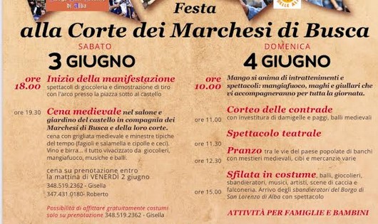 Sabato 3 e domenica 4 giugno Mango ripercorre la storia del suo tempo antico con la “Festa alla Corte dei Marchesi di Busca”. Giunta alla quinta edizione, la manifestazione storica ha inizio sabato 3 giugno alle ore 18 sulla piazza centrale con spettacoli di giocoleria e dimostrazioni di tiro con l’arco, mentre alle 19 nelle sale e nel giardino del castello è prevista la “Cena medievale” con piatti ispirati a quell’epoca storica oltre ad animazioni, musica e balli.