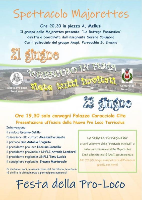 Tre serate all'insegna del divertimento per festeggiare la presentazione della "Nuova Pro Loco Torricolus": un evento che prende il via giovedì 21 alle ore 20.30 in Piazza Mellusi, con lo spettacolo delle majorettes "La Bottega Fantastica"; il 22 giugno ci sarà una serata con "cozze, cuppetiello e...", allietata da tanta musica.