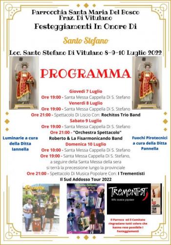 A Santo Stefano, frazione del Comune di Vitulano in provincia di Benevento si svolgono nei giorni 08, 09, 10 Luglio 2022 i Festeggiamenti in Onore di Santo Stefano.