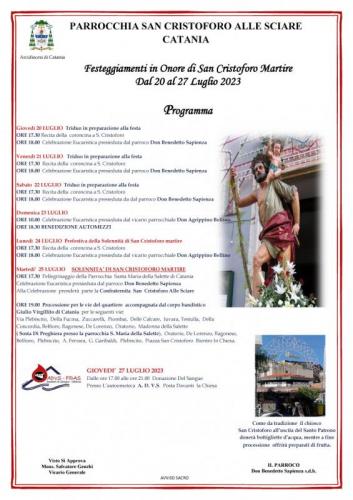 ORE 19.00 Processione per le vie del quartiere accompagnata dal corpo bandistico Giulio Virgillito di Catania per le seguenti vie: Via Plebiscito, Della Fucina, Zuccarelli, Piombai, Delle Calcare, luvara, Testulla, Della Concordia, Belfiore, Ragonese, De Lorenzo, Oratorio, Madonna della Salette ( Sosta Di Preghiera presso la parrocchia S. Maria della Salette), Oratorio, De Lorenzo, Ragonese, Belfiore, Plebiscito, A. Ferrara, G. Garibaldi, Plebiscito, Piazza San Cristoforo Rientro In Chiesa.