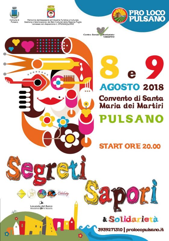 La Pro Loco di Pulsano, con il Patrocinio dell’Assessorato all’Industria Turistica e Culturale della Regione Puglia, del Comune di Pulsano, del Centro Servizi Volontariato di Taranto, e in collaborazione con Altramusicalive, Jonio Jazz, Associazione Smile, Associazione La ‘Ngegna, e Locanda del Barco, è lieta di annunciare alla cittadinanza la VI Edizione di Segreti & Sapori.