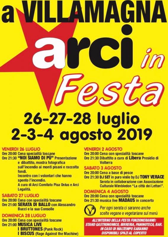 Dal 26 al 28 Luglio e dal 02 al 04 Agosto a Villamagna, frazione del Comune di Volterra (PI), si terrà Arci in Festa. Per due fine settimana questa località celebrerà le specialità toscane, anche vegane e vegetariane, in un clima di assoluta festa.