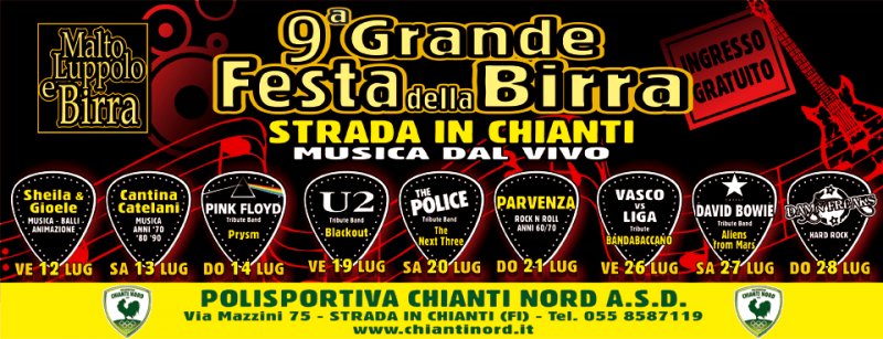 La Grande Festa della Birra, giunta alla nona edizione, si svolgerà a Greve in Chianti nei giorni 12-13-14, 19-20-21 e 26-27-28 Luglio 2019.