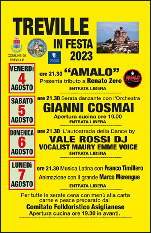 Come sempre la farà padrona la cucina del Comitato Folkloristico Asiglianese......con tanta buona musica....da gustarsi ammirando il bellissimo panorama che si gode dal belvedere della piazza di Treville.
