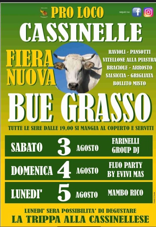 Anche quest'anno torna il primo fine settimana di Agosto si terrà a Cassinelle, presso il campo sportivo al di sotto del comune, la FIERA NUOVA DEL BUE GRASSO.