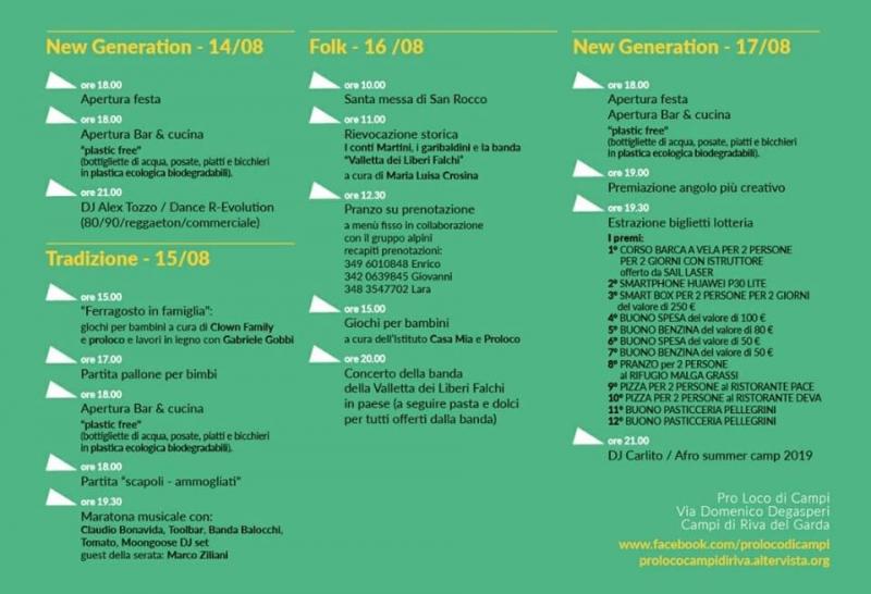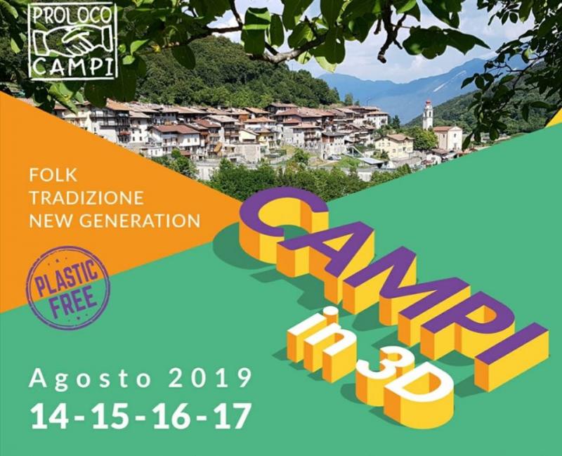 Soffia un vento di festa a Campi, il paese montano di Riva del Garda: dal 14 al 17 Agosto 2019 la Pro loco propone per il secondo anno quattro giorni di festeggiamenti nella zona polivalente che si riassumono nell’evocativo titolo "Campi in 3D, new generation, folk e tradizione".