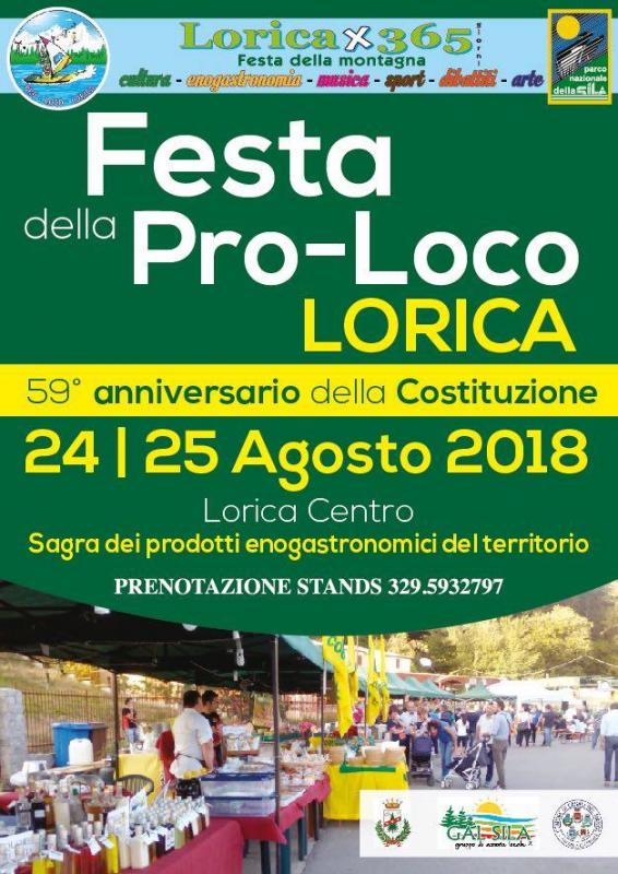 A Lorica in provincia di Cosenza si svolge nei giorni 24 e 25 Agosto 2018 la Festa della Pro-Loco Lorica. Sagra di prodotti enogastronomici - 59^ Anniversario della Pro-Loco - Lorica Centro
