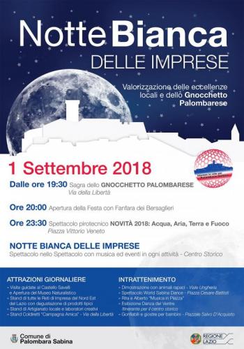 Nella notte tra il 1 ed il 2 Settembre si svolgerà la Notte Bianca delle Imprese, che si aprirà con la Sagra dello Gnocchetto Palombarese, un piatto tipico della tradizione culinaria locale. Tante attrazioni giornaliere ed intrattenimento accompagneranno i partecipanti per le vie del centro storico, con visite guidate, stand enogastronomici delle altre Reti di Imprese del Lazio e di artigianato, negozi aperti, degustazioni e spettacoli, come le suggestive Fontane Danzanti di Cazacu’s, che uniscono Acqua, Aria e Fuoco in uno spettacolo unico tra realtà e magia.