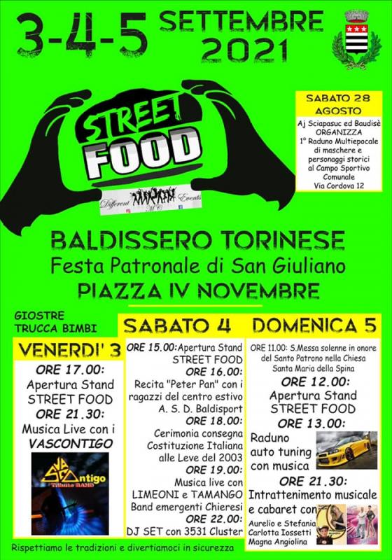 Torna la Festa patronale a Baldissero Torinese con un percorso enogastronomico da leccarsi i baffi e da gustare a suon di musica… Venerdì 3 STREET FOOD con i VASCOntigo , Sabato 4 settembre STREET FOOD con intrattenimenti a 360 gradi, Domenica 5 settembre STREET FOOD con RADUNO AUTO TUNING selezionate e alle 21.30 varietà musicale e comico con Aurelio e Stefania e Carlotta Iossetti direttamente da Primantenna - can. 14