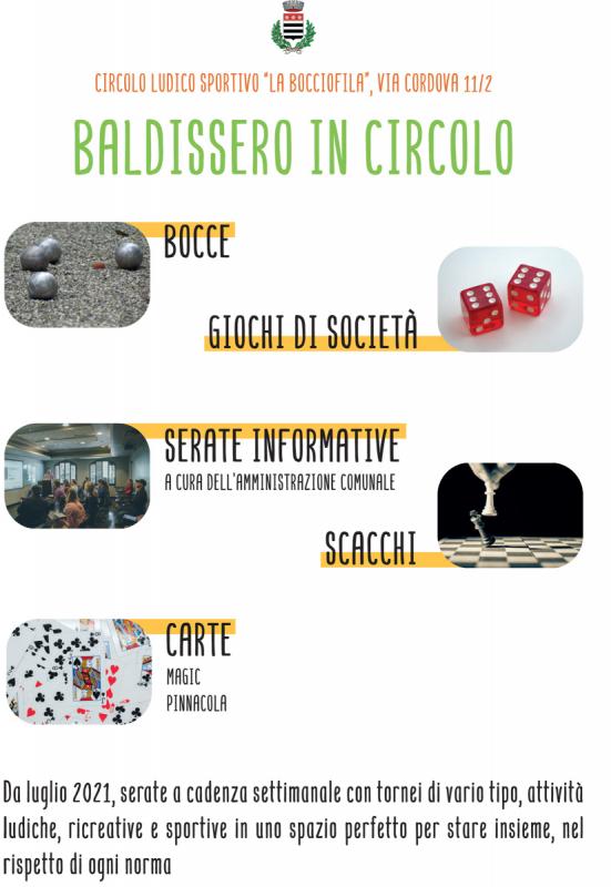 "Baldissero in Circolo" è il nome della rassegna ideata dall'Amministrazione Comunale, in collaborazione con l'ASD Società Bocciofila Baldisserese, per sfruttare e valorizzare al meglio gli spazi pubblici e all'aperto, rilanciando la struttura della bocciofila situata in via Cordova accanto al campo sportivo.