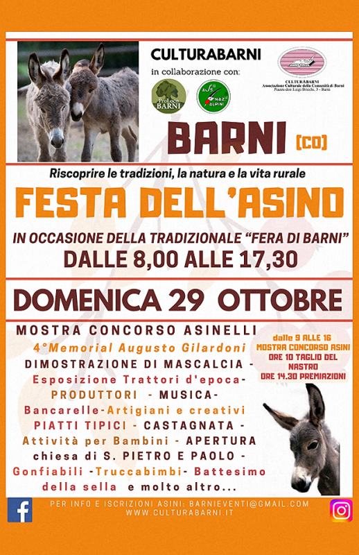 Quella che si prospetta è una giornata all'insegna della tranquillità nel piccolo borgo comasco di Barni, dove le mucche e i cavalli pascolano ancora tranquilli nella campagna e in pochi minuti puoi immergerti nel bosco a far castagne e funghi ed avvistare caprioli. Quest'anno ritornano anche i simpatici asinelli per la mostra concorso 4° memorial Augusto Gilardoni.