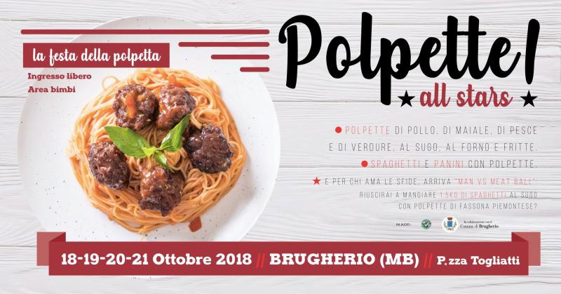 Da Giovedì 18 a Domenica 21 Ottobre va in scena POLPETTE ALL STARS, La Festa della Polpetta 2018: uno dei più grandi appuntamenti enogastronomici dedicati alla Polpetta, in tutta la sua tradizione e le sue tipologie (e soprattutto in tutte le salse), accompagnata da Birre selezionate, Eventi e Animazione - presso la Piazza Togliatti di Brugherio (MB).